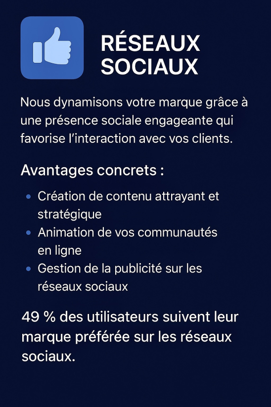 Une présence active et stratégique sur les réseaux sociaux est aujourd’hui indispensable. Nous créons pour vous des contenus engageants, animons vos communautés et gérons vos campagnes publicitaires pour booster votre visibilité et générer de l’interaction. Chaque publication est conçue pour transmettre votre message de manière impactante. Résultat : une marque vivante, suivie, partagée et proche de ses clients.
