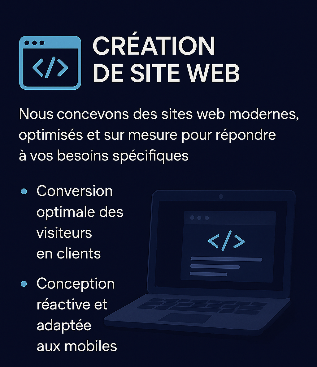 Votre site web est bien plus qu’une vitrine : c’est un véritable outil de conversion. Nous concevons des sites modernes, rapides et optimisés pour offrir une expérience utilisateur fluide, que ce soit sur ordinateur ou mobile. Chaque projet est pensé pour transformer vos visiteurs en clients grâce à un design impactant et des fonctionnalités adaptées à vos objectifs. 👉 Résultat : un site professionnel qui inspire confiance et qui soutient votre croissance.