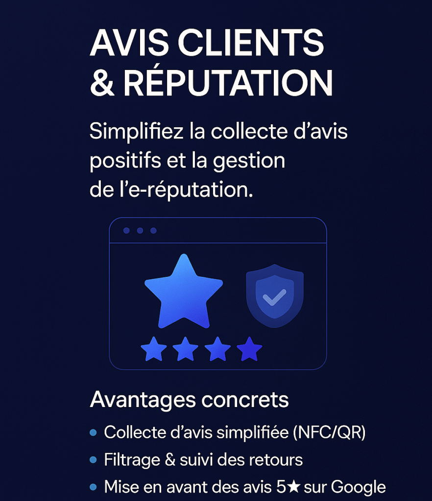 Aujourd’hui, les avis clients déterminent la confiance et la crédibilité d’une entreprise. Une mauvaise gestion de réputation peut freiner votre développement. Avec notre solution NFC innovante, vous facilitez la collecte d’avis positifs tout en réduisant l’impact des retours négatifs. Nous vous aidons à mettre en avant la satisfaction de vos clients et à améliorer votre note Google. 👉 Résultat : une réputation solide qui attire de nouveaux prospects et fidélise vos clients existants.