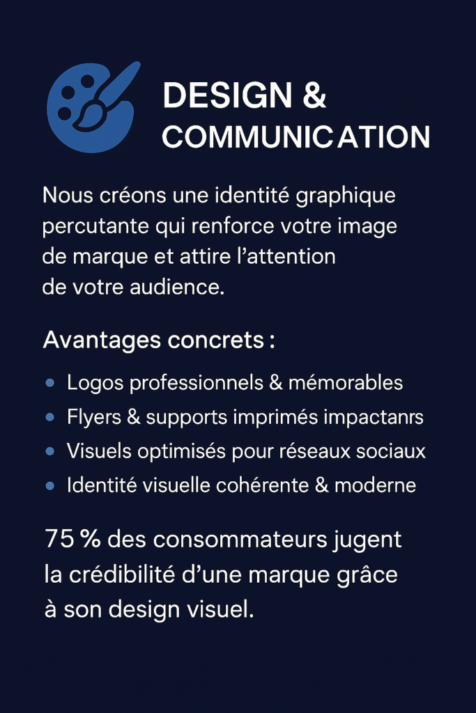 Votre image de marque est la première impression que vous laissez. Nous vous aidons à créer une identité visuelle percutante, cohérente et professionnelle qui vous distingue de la concurrence. Logos mémorables, chartes graphiques, flyers, visuels pour réseaux sociaux… chaque élément est pensé pour attirer l’attention, renforcer votre notoriété et inspirer confiance à votre audience. Résultat : une marque visuellement forte qui séduit et reste en mémoire.